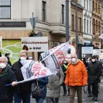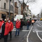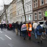 Der Einsatzleiter der Polizei hat daraufhin die Verantwortlichen kurz an die Auflagen erinnert: Die Kolonne soll im Schritttempo laufen, es muss für Abstand und Maskentragen gesorgt werden, die Teilnehmer müssen konzentriert im Zug laufen und dürfen keine Flyer an die Passanten verteilen. Dann ging es gegen 11.00 Uhr in Richtung Ebertplatz los. Die gesamte Route, die wieder am Ausgangspunkt endete, war ca. 5 Kilometer lang. Der Himmel war grau, es blieb aber trocken.