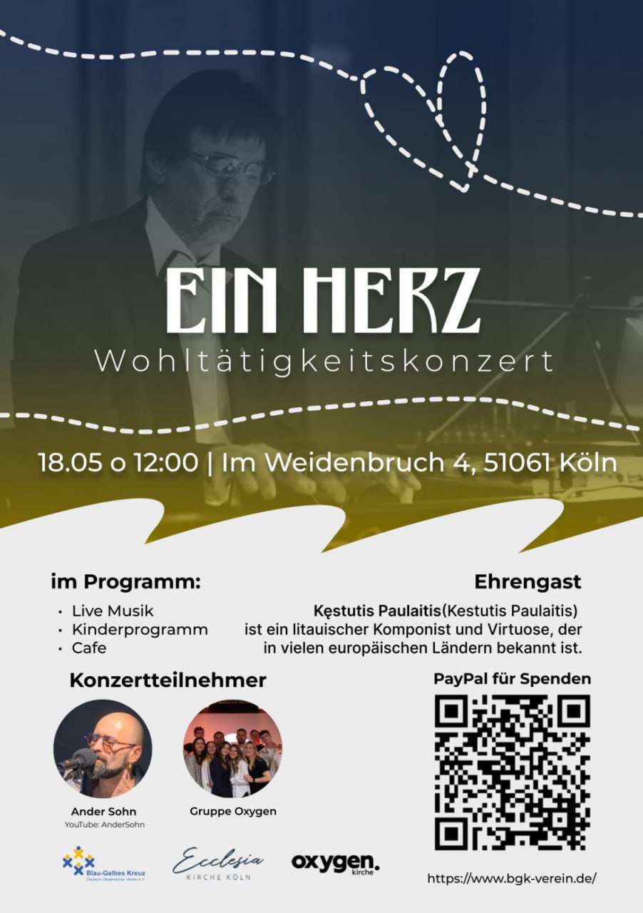 Der Komponist und Pianist Kestutis Paulaitis bringt jetzt seine einzigartigen Farben ein, und ukrainische Melodien klingen in seiner Aufführung wie eine echte Entdeckung für das europäische Publikum. Seine Konzertreise mit eigenen Werken und den besten Beispielen der klassischen und spirituellen Musik verspricht ein unvergessliches Erlebnis zu werden.