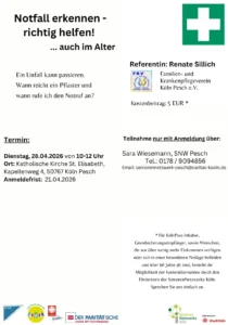 Der Kurs richtet sich gezielt an Seniorinnen, Senioren und deren Angehörige, um mehr Sicherheit im Umgang mit medizinischen Notsituationen zu gewinnen. Als Referentin konnte Renate Sillich vom Familien- und Krankenpflegeverein Köln Pesch e.V. gewonnen werden. Sie gibt praxisnahe Tipps, wie man Symptome richtig einschätzt und im Ernstfall besonnen reagiert.